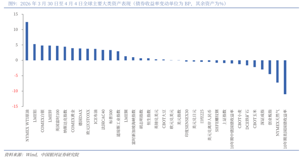 The core driver of global market volatility this week still comes from the Middle East geopolitical conflict and energy shocks. With Iran’s fighting remaining deadlocked and passage through the Strait of Hormuz disrupted, market concerns about a disruption to global crude oil supply have risen markedly, pushing WTI crude oil prices to record highs and lifting energy and some resource prices overall, while also raising potential inflation expectations. Against this backdrop, precious metals and some industrial metals have strengthened in sync. Meanwhile, energy shocks combined with inflation uncertainty lead major central banks to remain cautious about policy shifts. Fed officials have generally released signals that they will keep interest rates unchanged, but U.S. Treasury yields have fallen overall. In equities, U.S. nonfarm payroll employment was clearly better than expected, and active capital operations in the technology sector supported market sentiment, enabling U.S. and European stock markets to rebound after midweek fluctuations. By contrast, China’s equity markets were relatively weaker, affected by adjustments in growth sectors and a decline in risk appetite.