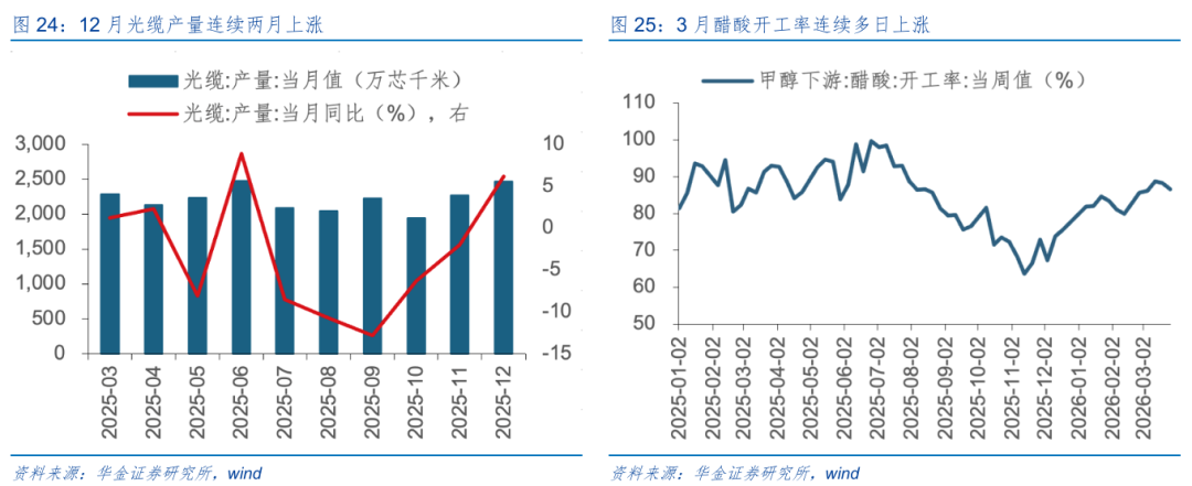 In the short term, the recommendation is to allocate at low levels to communications (AI hardware), electronics (semiconductors, AI hardware), electric power & new energy (AI power, energy storage), innovative drugs, non-ferrous metals, chemicals, defense (commercial aerospace), and other sectors with supportive policies and upward industry trends. (1) Communications: first, December’s optical cable output rose for two consecutive months, up 8.73% month-over-month, up 27.24% versus October, and up 6.20% year-over-year. Second, the 2026 China On-Device AI Chips and Smart Terminal Innovation Conference will be held in Shenzhen from April 9–11, 2026. The conference focuses on breakthroughs in on-device AI chip technology, ecosystem integration, and innovation in smart terminals. It gathers industry strength to explore technical paths and application scenarios, injecting strong momentum into industry chain upgrades. (2) Electronics: first, the 14th China Electronics Information Expo (CITE2026) will be held in Shenzhen on April 9–11 at the Shenzhen Convention and Exhibition Center (Futian). The expo is themed “New Technologies, New Products, New Scenarios,” and sets up eight exhibition areas: consumer electronics, embodied intelligence, AI big models/intelligent computing centers, AI+ application scenarios, integrated circuits, low-altitude economy, electronic components, special electronics, and dual-use electronics technologies. It systematically showcases innovation across the entire industrial chain. Second, the 2026 (5th) Semiconductor Ecological Innovation Conference will be held in Shanghai on April 22–23. This conference is themed “Ecosystem Deep Integration and Innovation-Driven Breakthrough,” bringing together efforts from government, industry, academia, research, and application stakeholders to help China’s semiconductor industry strengthen its core competitiveness and promote efficient global integration and coordinated development of the semiconductor industry. (3) Electric power & new energy: the 2026 (6th) Forum on Technology Development and Industry Development of Solid Oxide Batteries will be held in Chengdu, Sichuan on April 15–17, 2026. The forum is themed “Stepping into the SOC-scale Net-Zero Carbon Era,” accelerating the connection across the industrial chain and contributing to the energy-structure transition under the dual-carbon goals. (4) Healthcare/pharmaceuticals: first, the 8th World Healthy Life Expo will be held in Wuhan at the Optics Valley of China Science & Technology Exhibition Center on April 8–10. The expo will gather global wisdom through innovative formats, injecting new momentum into high-quality development of the industry. Second, the 2026 CMEF 93rd China International Medical Devices Exhibition will be held at the National Exhibition and Convention Center from April 9–12. (5) Non-ferrous metals: first, the Non-ferrous Metals Industry Intelligent Manufacturing, Low-Carbon Standards Conference and Standards Dissemination Meeting will be held in Quzhou, Zhejiang Province on April 7–10, 2026. It focuses on key hot directions for intelligent manufacturing and digital transformation standards and low-carbon standards during the “15th Five-Year Plan” period, accelerating the development, implementation, and application of standards. Second, the SMM AICE (21st) Aluminum Industry Conference and Aluminum Industry Expo will be held in Suzhou, Jiangsu, from April 8–10. This expo brings together high-quality resources from global aluminum industry chains and downstream terminal application fields, building an ecosystem platform for coordinated upstream and downstream development in the aluminum industry. (6) Chemicals: first, the acetic acid operating rate rose for multiple consecutive days in March; by mid-March, the acetic acid operating rate reached the highest level in nearly half a year and fluctuated near that peak. Second, the 2026 International Chemical New Materials Cooperation and Overseas Expansion Summit will be held in Suzhou on April 14. The conference will conduct in-depth exchanges around topics such as “overseas chemical park investment promotion policies,” “overseas investment regulations,” and “overseas-funded enterprise briefings.” Third, the 4th COC/COP Technology and Market Conference will be held in Shenzhen on April 8–10. The conference will provide an exchange platform to improve the trial-production qualification rate for COC/COP, accelerate application verification and optimization, and improve effective production capacity of installations. (7) Defense: first, the 2026 Defense Industry Surface Engineering Technology Conference will be held in Chengdu, Sichuan on April 22–24, 2026. The meeting is themed “Low-Carbon Leading the Way, Digital Intelligence Empowering, and Integration-Driven Development,” helping advance high-quality development of China’s defense science and technology industry and equipment manufacturing. Second, the 2026 China Aerospace Conference (China Space Conference 2026) will be held in April 2026, strengthening aerospace systems engineering construction, promoting scientific development in the aerospace industry, and facilitating cooperation and exchanges at home and abroad.
