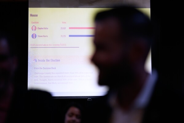 Election results roll in as Republican candidate Clay Fuller, front, speaks with attendees during an election night watch party, Tuesday, April 7, 2026, in Ringgold, Ga. (AP Photo/Mike Stewart)