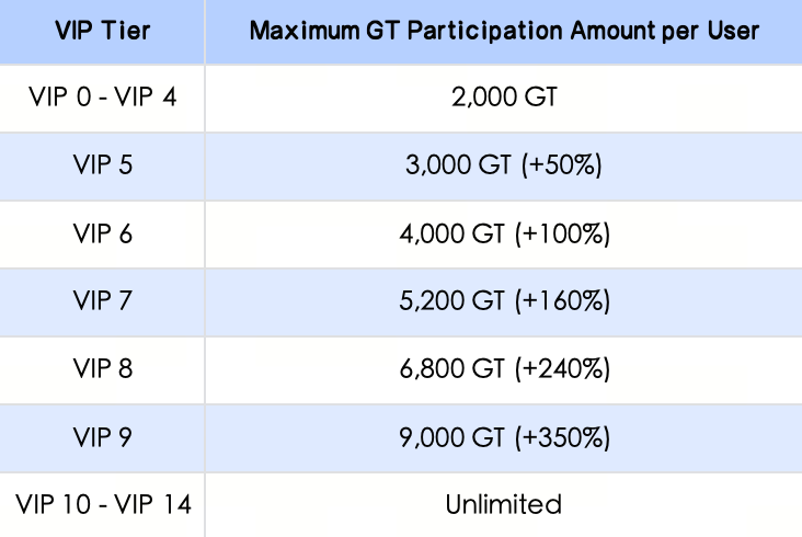 Conclua a verificação de identidade e possua pelo menos 1 GT para compartilhar o total do pool de recompensas com base na proporção do snapshot das suas participações em GT. Para este evento, o limite de participação para usuários VIP0–VIP4 é de 2.000 GT, enquanto usuários VIP10 e acima podem usufruir de cotas ilimitadas de participação.