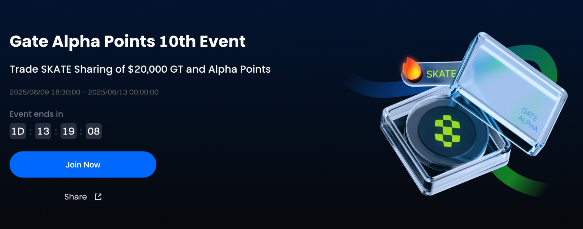 Durante o período do evento, os usuários que negociarem SKATE na plataforma Gate Alpha com um volume de negociação acumulado de não menos que 100 USDT receberão uma recompensa de airdrop de 0,1 a 1 GT. Valor total do prêmio: $20.000 em GT, oportunidades são limitadas, quem chegar primeiro leva!