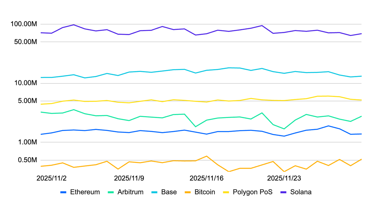 Em novembro de 2025, a capitalização total do mercado de criptomoedas manteve uma tendência de baixa, influenciada pela fraqueza na força compradora, pela crescente incerteza macroeconômica e pela redução do apetite por risco, fatores que impediram qualquer recuperação relevante. A capitalização de mercado das stablecoins nas blockchains públicas seguiu altamente concentrada, com a Ethereum respondendo por mais da metade do volume total; os fluxos de fundos apontaram para uma divergência crescente entre setores, com blockchains como Arbitrum e Starknet registrando entradas líquidas significativas. Ao mesmo tempo, o mercado de previsões continuou em rápida expansão, com o volume mensal de negociações da Opinion aumentando fortemente e posicionando-se rapidamente como o terceiro grande concorrente, ao lado de Polymarket e Kalshi. O setor Web3 concluiu 53 rodadas de financiamento, somando US$2,67 bilhões, uma queda expressiva em relação a outubro, indicando um período de retração e ajuste estrutural.