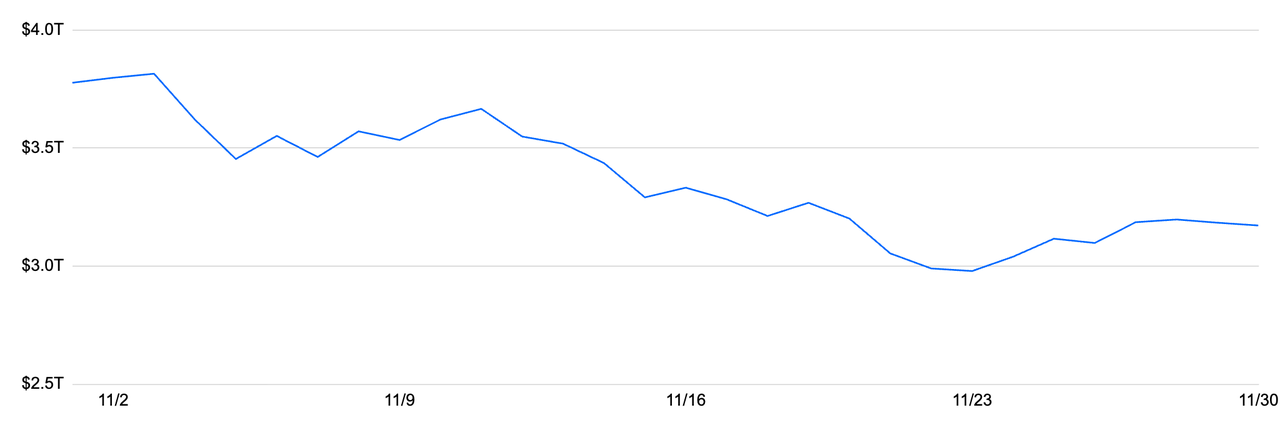 • Desempenho do Mercado Cripto: Em novembro de 2025, a capitalização total do mercado de criptomoedas caiu de forma geral. Após uma breve alta no início do mês, os preços recuaram rapidamente, com algumas tentativas de recuperação de baixa intensidade ao longo do mês. Estruturalmente, a demanda de compra insuficiente, o aumento da incerteza macroeconômica e o menor apetite por risco limitaram o potencial de valorização.