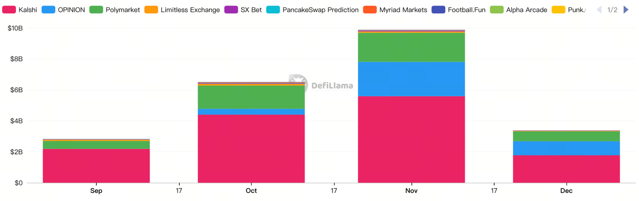 • Principais Movimentos Setoriais: O mercado de previsões cresceu rapidamente, passando de um duopólio Polymarket–Kalshi para uma estrutura com três participantes. O volume de negociações da Opinion disparou durante o mês, consolidando-se como uma terceira força e elevando o volume total do setor para próximo de US$10 bilhões.