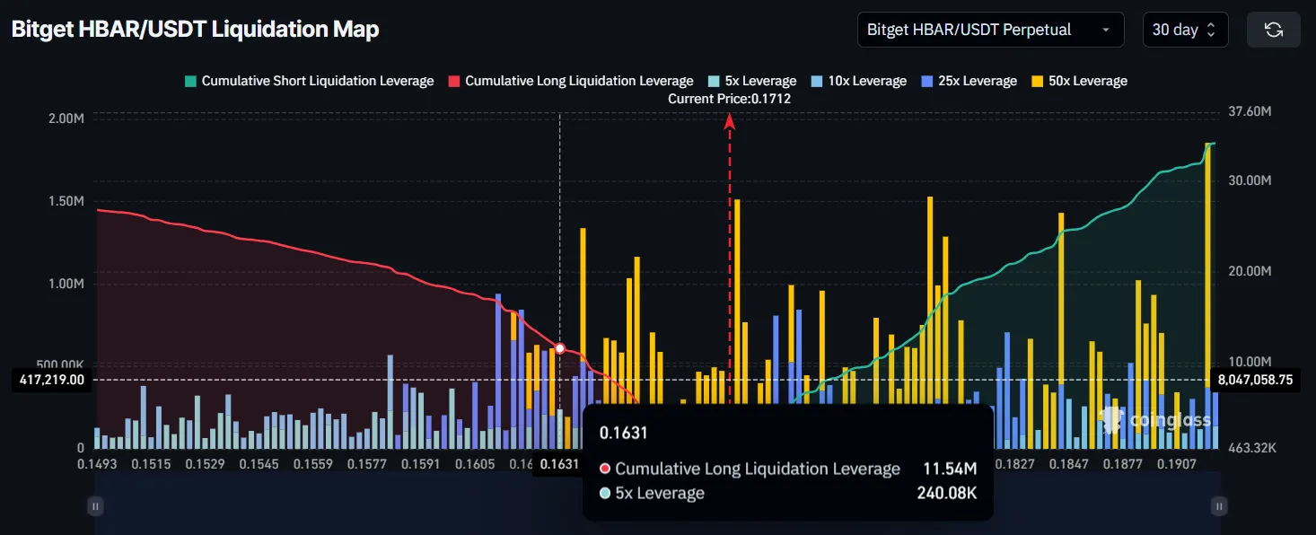 O mapa de liquidação da HBAR mostra a dinâmica macro da moeda, ao mesmo tempo em que alerta os traders sobre os riscos potenciais se a tendência de baixa persistir. Se a HBAR não conseguir manter o nível de suporte atual em US$ 0,163, uma liquidação adicional de US$ 11,5 milhões pode ser desencadeada, criando um forte impulso de baixa.