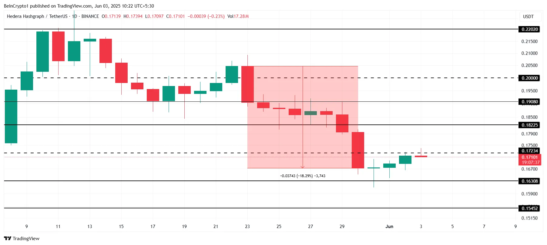 Se o HBAR não conseguir ultrapassar o nível de 0,172 dólares, é muito provável que ele apenas se consolide em torno do nível de suporte de 0,163 dólares. Se esse nível de suporte for quebrado, o HBAR pode continuar a cair para 0,154 dólares, aumentando a pressão de venda e ativando mais liquidações.