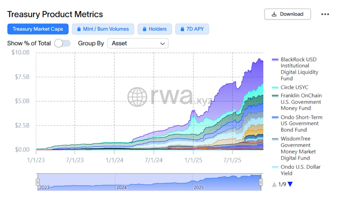 De acordo com o gráfico de tamanho de mercado publicado pela RWA.xyz, os títulos do governo tokenizados (Tokenized Treasuries) cresceram de menos de 500 milhões de dólares no início de 2023 para dezenas de bilhões de dólares em 2024, e devem se aproximar da marca de 10 bilhões de dólares em 2025, impulsionados por várias instituições, incluindo BlackRock, Franklin, Securitize e Ondo. Esse crescimento não significa que os ativos tradicionais estão migrando para a blockchain, mas indica que o interesse dos usuários de criptomoedas em obter rendimentos fora da cadeia está aumentando, e a alocação entre ativos está se estendendo da interface da plataforma para a camada da blockchain.