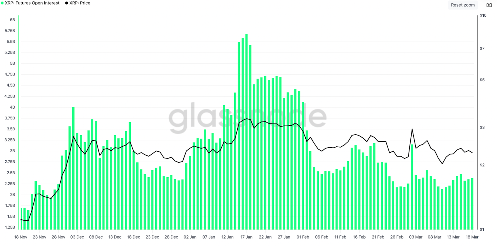 Da mesma forma, o OI do XRP no mercado de contratos futuros caiu de um pico local de 5,67 bilhões de dólares em 17/1 para 2,4 bilhões de dólares em 18/3. O OI mede o total de contratos futuros em circulação e a queda indica que os traders estão saindo de suas posições.