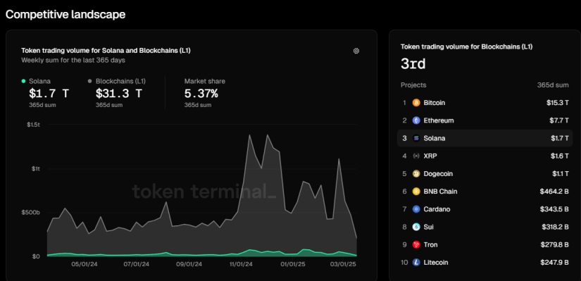 Como resultado, o volume de transações e a receita de aplicativos descentralizados (dApp) na Solana, como Pump.fun, JitoSOL e JupiterDEX, despencaram. Segundo a TokenTerminal, o volume total de transações de tokens na Solana caiu de 80 bilhões de dólares em janeiro para apenas 28 bilhões de dólares em março. Em particular, a queda no número de bots de negociação – que chegaram a representar até 86% do total de transações em seu pico – enfraqueceu ainda mais esse ecossistema.
