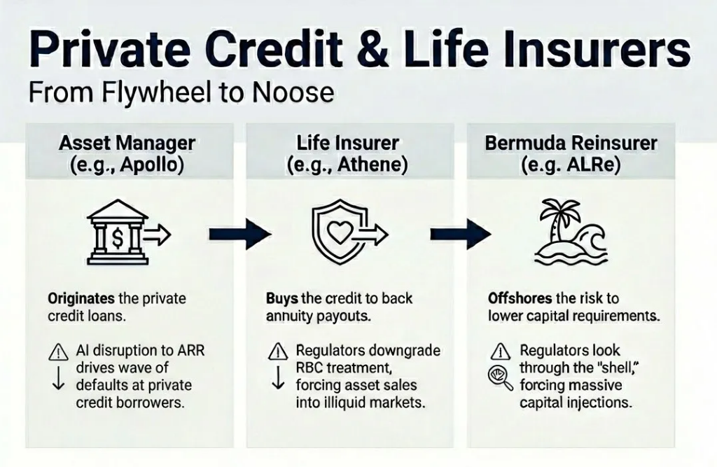 Se tudo ficar nisso, o autor admite que “seria controlável” — o crédito privado é, em sua maioria, fechado, com prazos fixos, sem força de venda forçada. Mas o “capital permanente” revela uma outra face: grandes gestores alternativos, ao adquirirem seguradoras de vida, transformam as obrigações de anuidades em lastro de financiamento de crédito privado (o texto cita Apollo/Athene, Brookfield/American Equity, KKR/Global Atlantic). Quando as inadimplências de software se espalham, a regulação de seguros começa a apertar o risco desses ativos, obrigando as instituições a reforçar capital ou vender ativos, mas o mercado não consegue fazer isso a preços justos. A Moody’s coloca a classificação de Athene com perspectiva negativa, e a ação da Apollo cai 22% em dois dias, impactando outras instituições similares.