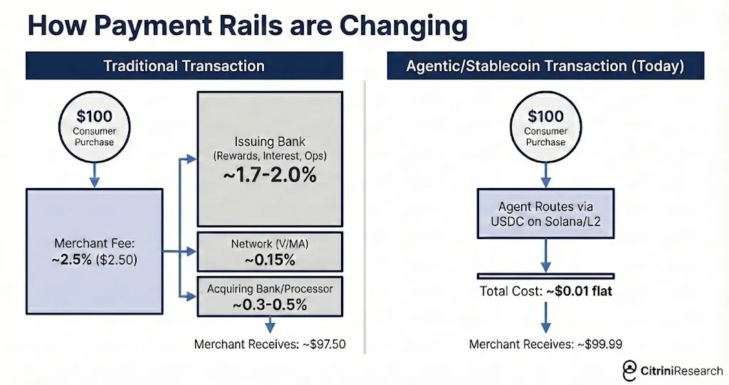 Quando os assistentes controlam as transações, eles vão buscar “maiores alavancas”: nas transações máquina a máquina, as taxas de troca de cartões de 2-3% tornam-se visíveis demais. O autor imagina que muitos assistentes passem a usar stablecoins em redes como Solana ou Ethereum L2, com custos próximos a “frações de centavo”. Nesse trecho, o Mastercard é descrito como um “ponto de inflexão irreversível”: na apresentação de resultados, a gestão fala de “otimização de preços por IA” e “pressão sobre o consumo opcional”, levando a uma queda no valor das ações; o risco se espalha para bancos emissores e redes de cartões, especialmente AmEx, mais afetada pelo “duplo golpe” — clientes de escritório cortados e taxas evitadas.