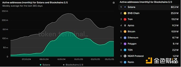 Сравнение ежемесячно активных адресов Solana с конкурентами уровня 1. Источник: Token Terminal