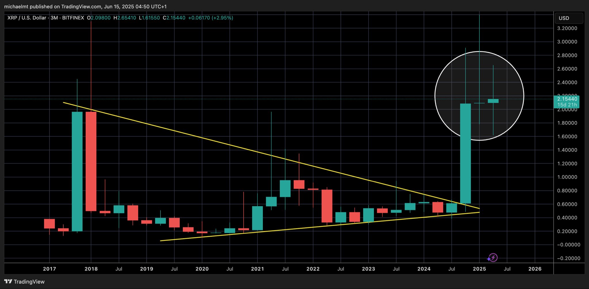 Бот Gate News, эксперт рынка «Crypto Michael» недавно опубликовал технический график на X (ранее Twitter), показывающий, что Ripple (XRP) консолидируется в течение семи месяцев после ошеломляющего роста цены на 700%, и это ралли было вызвано симметричным треугольником, который прорывался в течение многих лет. График основан на 3-месячном свечном графике, который показывает, что XRP пережил семь лет значительного сжатия цены в форме треугольника.