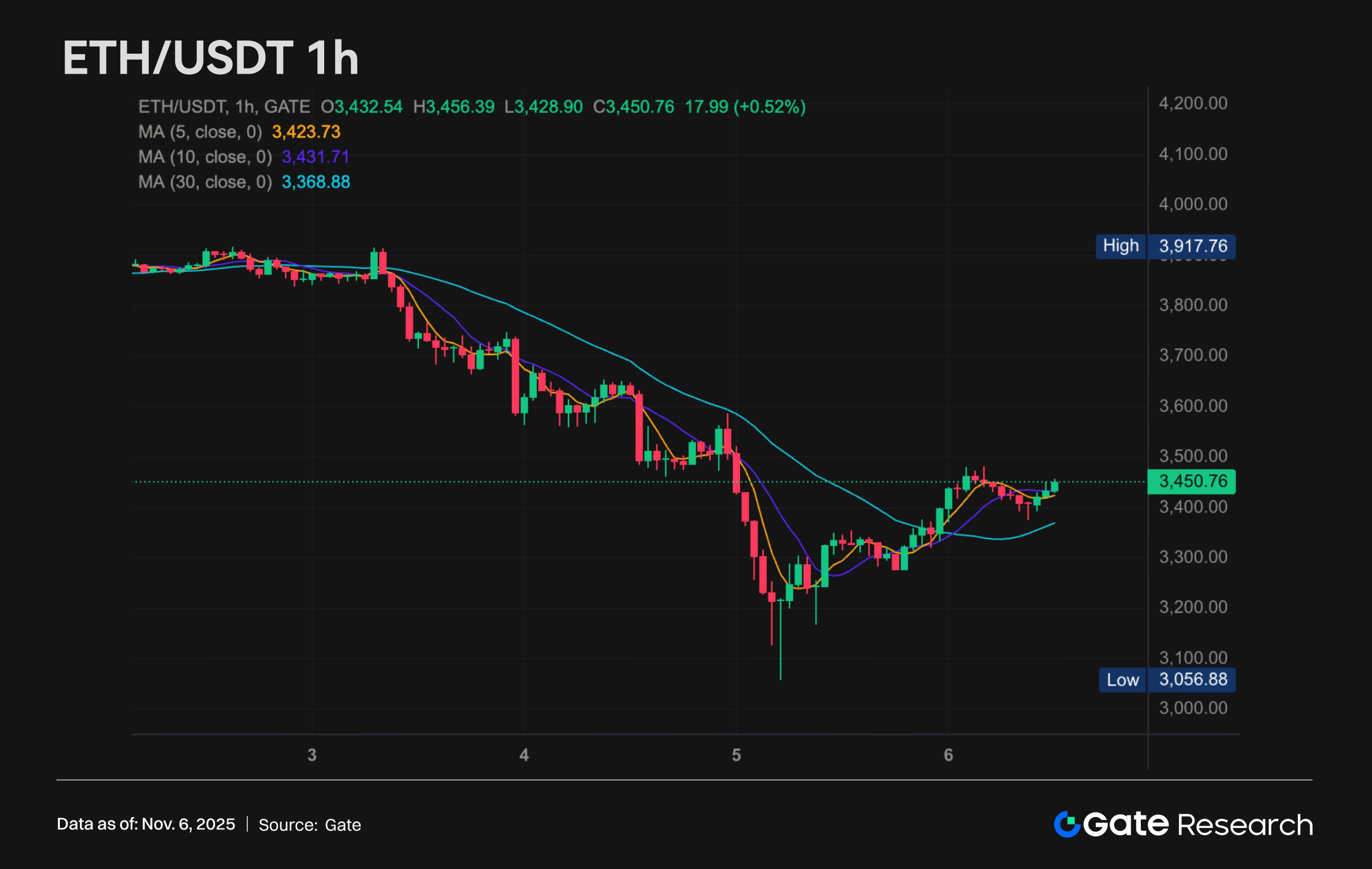 Цена эфириума в начале ноября быстро отскочила до уровня около 3,400 долларов после снижения до примерно 3,056 долларов, и на краткосрочном горизонте проявляются явные признаки остановки падения. Однако с технической точки зрения ETH по-прежнему находится под давлением краткосрочных скользящих средних, MA5 и MA10 продолжают снижаться и формируют медвежье расхождение, что указывает на то, что отскок носит характер коррекции, а не разворота тренда. Хотя объем торгов на короткое время увеличился, в дальнейшем не наблюдается значительного продолжения, а покупательская активность остается слабой. По индикатору MACD обе линии находятся ниже нулевой оси, зеленые столбцы сокращаются, но еще не стали красными, что показывает, что медвежья активность замедляется, но не полностью переходит в бычью. В целом, если ETH не сможет эффективно преодолеть диапазон 3,500–3,700 долларов и закрепиться выше MA10, существует риск повторного тестирования поддержки на уровне 3,200–3,050 долларов. Краткосрочная динамика остается волатильной, рыночные настроения по-прежнему склонны к осторожности.