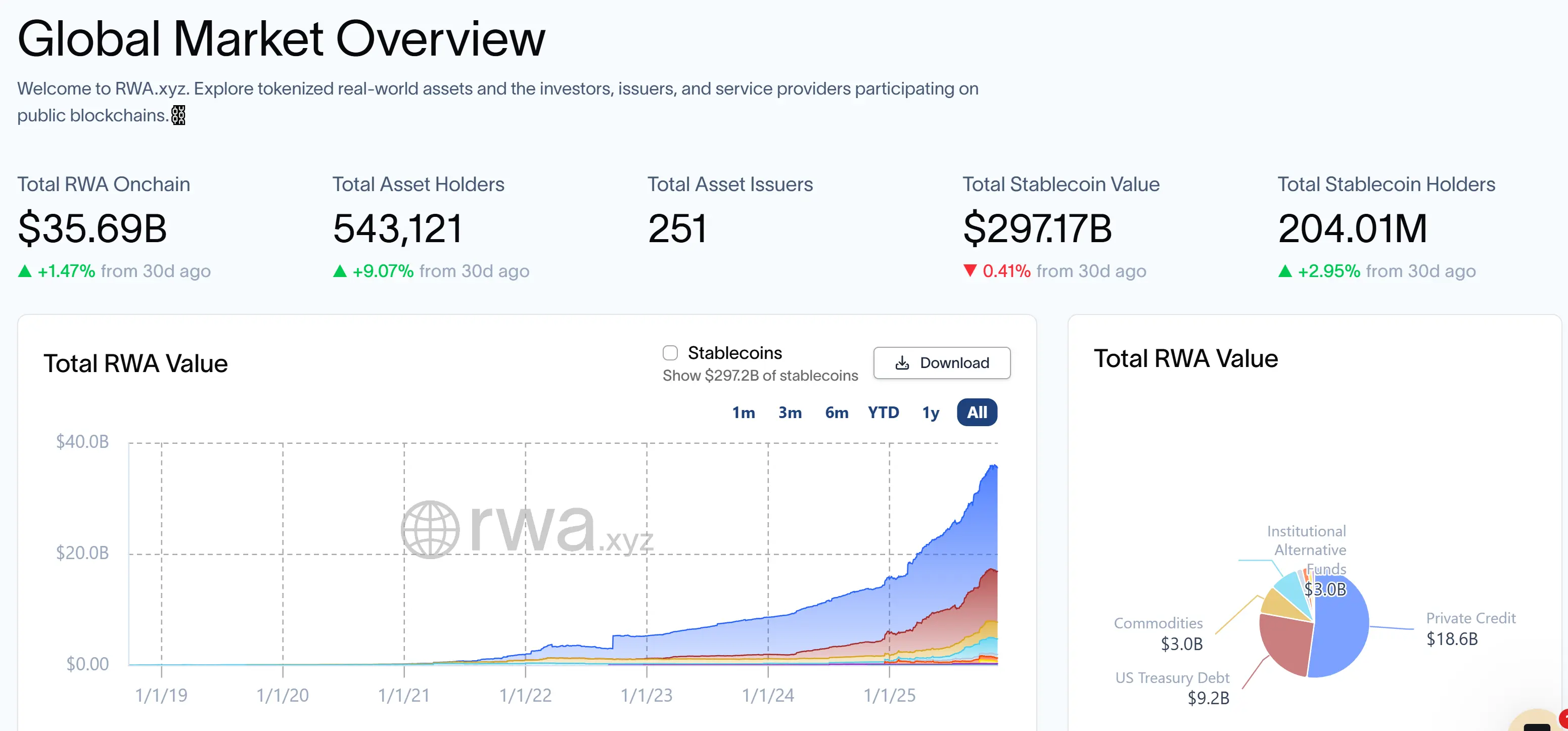Согласно RWA.xyz, рынок токенизированных активов вырос с $5 миллиарда до более чем $35.6 миллиарда с начала 2023 года.
