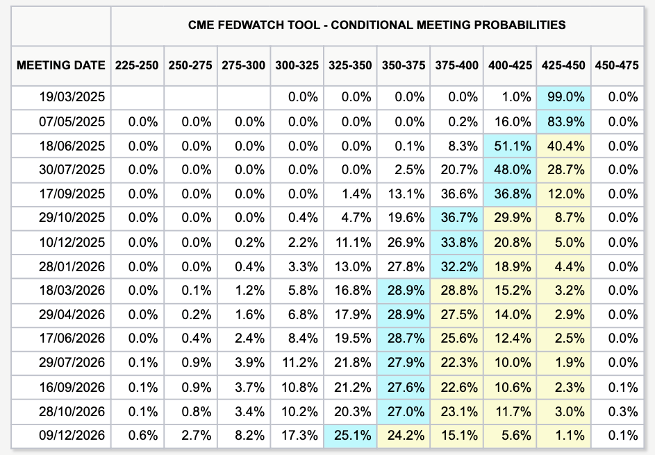 ! Вероятность целевой ставки ФРС | Источник: CME GroupСуть последующих комментариев главы ФРС Джерома Пауэлла вызывает большее беспокойство у трейдеров. Уже заняв жесткую позицию, Пауэлл теперь сталкивается с давлением со стороны торговых тарифов США, поскольку инфляционный рынок только начинает падать.