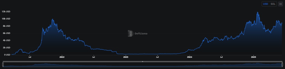 Общий объем депозитов Solana (TVL) в настоящее время увеличился до примерно 8,7 миллиарда долларов (около 1,2 триллиона йен). Он восстановился до уровня, достигнутого с февраля.