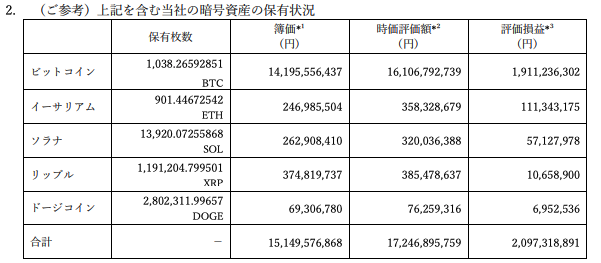 По состоянию на 12 июня, активы компании состоят из пяти видов криптоактивов, включая Биткойн. Общая рыночная капитализация всех криптоактивов составляет примерно 17,246,900,000 иен, а оценка прибыли и убытков составляет примерно 2,097,320,000 иен в плюсе.