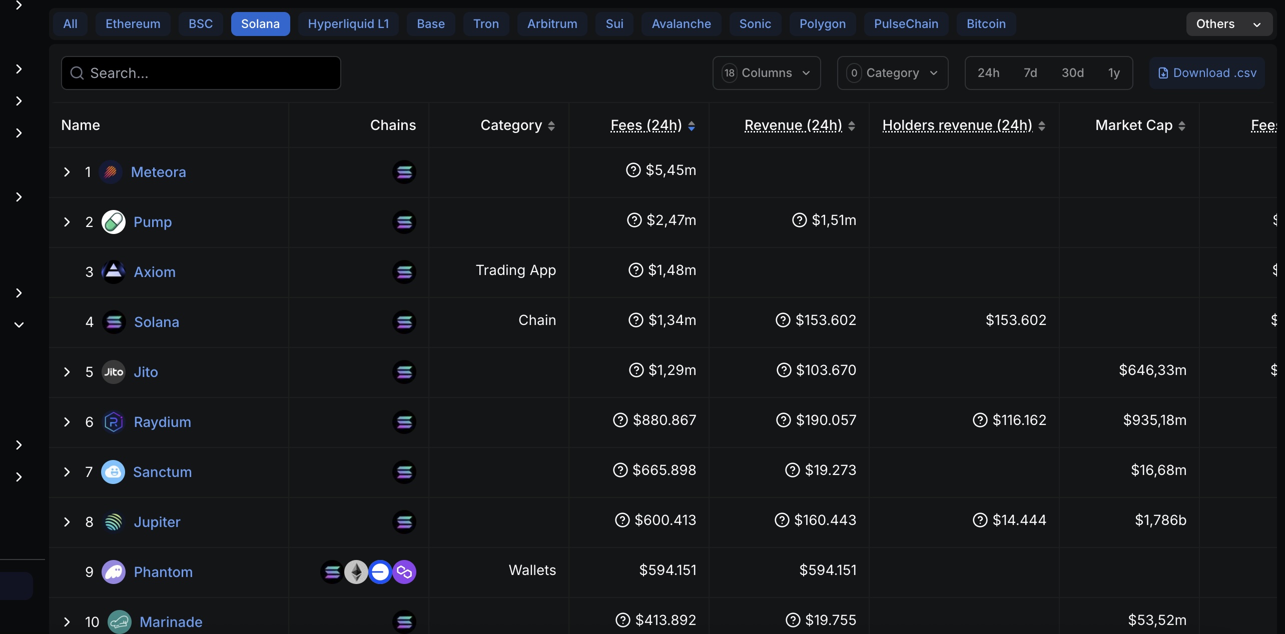 ตาม DeFiLlama, Meteora เป็น dApp ที่สร้างค่าธรรมเนียมมากที่สุดใน Solana โดยทำได้ 5.45 ล้าน USD ในช่วง 24 ชั่วโมงที่ผ่านมา — เป็นสองเท่าของ Pump Fun ที่น่าสังเกต ทั้งสาม dApp ได้แก่ Meteora, Pump Fun และ Axiom ขณะนี้สร้างค่าธรรมเนียมรวมสูงกว่าทั้งเครือข่าย Solana ทั้งหมด.