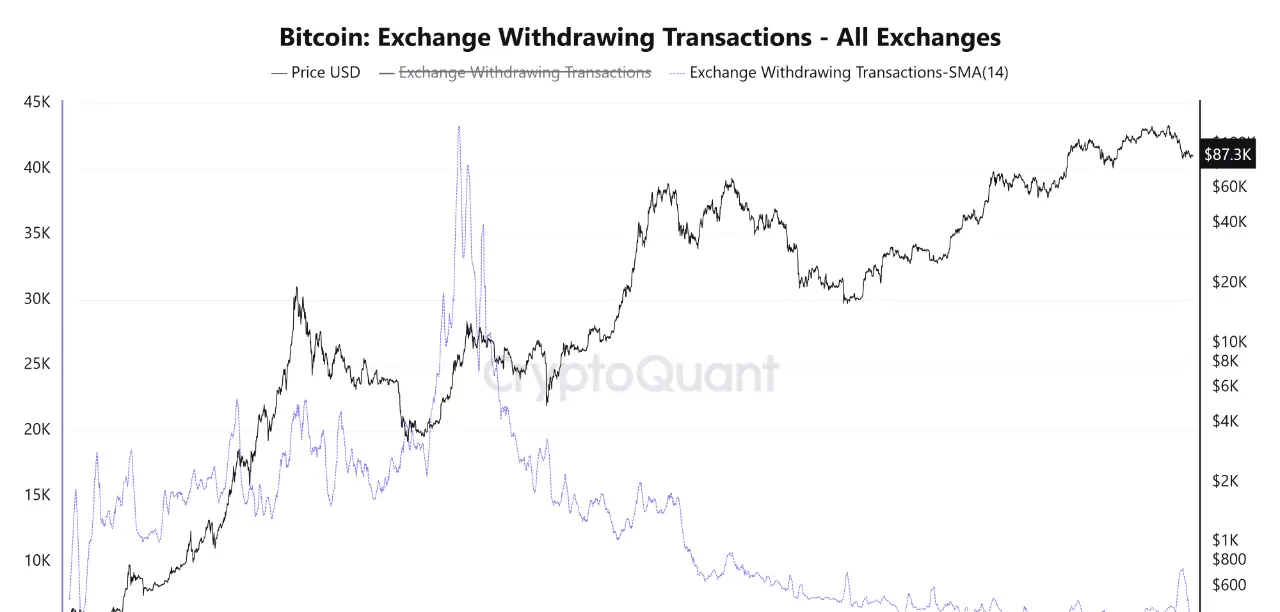 Another notable on-chain observation supports the bearish hypothesis. The indicator here is the Bitcoin Exchange Withdrawing Transactions (7-day Moving Average) metric, which keeps tabs on the number of on-chain withdrawal transactions made from cryptocurrency exchanges over a period of seven days.