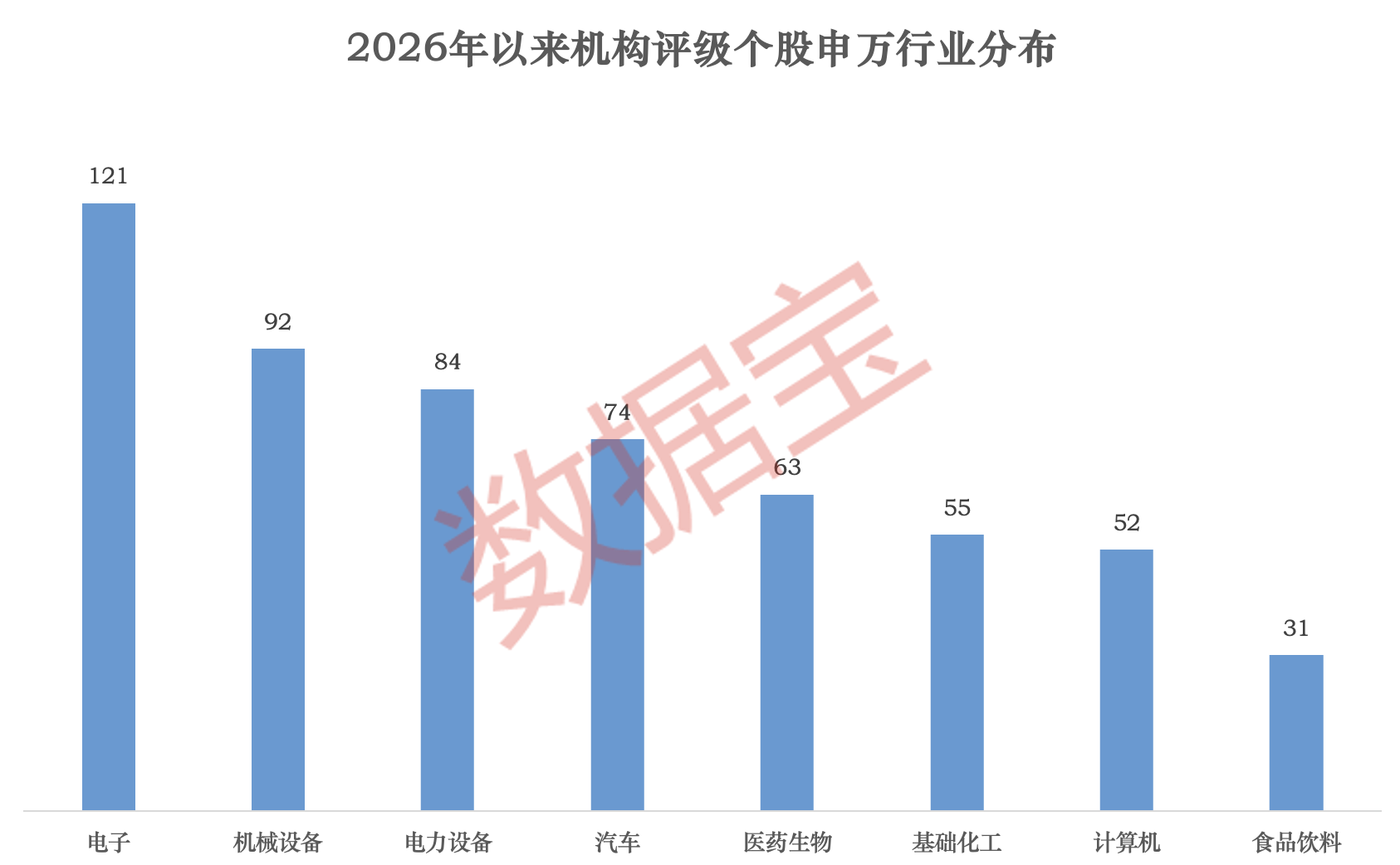 In terms of industry distribution, the stocks rated by institutions are mainly in electronics, machinery equipment, and power equipment industries, with the number of stocks listed as 121, 92, and 84 respectively; automotive, pharmaceuticals and biotech, basic chemicals, and computers follow closely, each with more than 50 rated stocks.