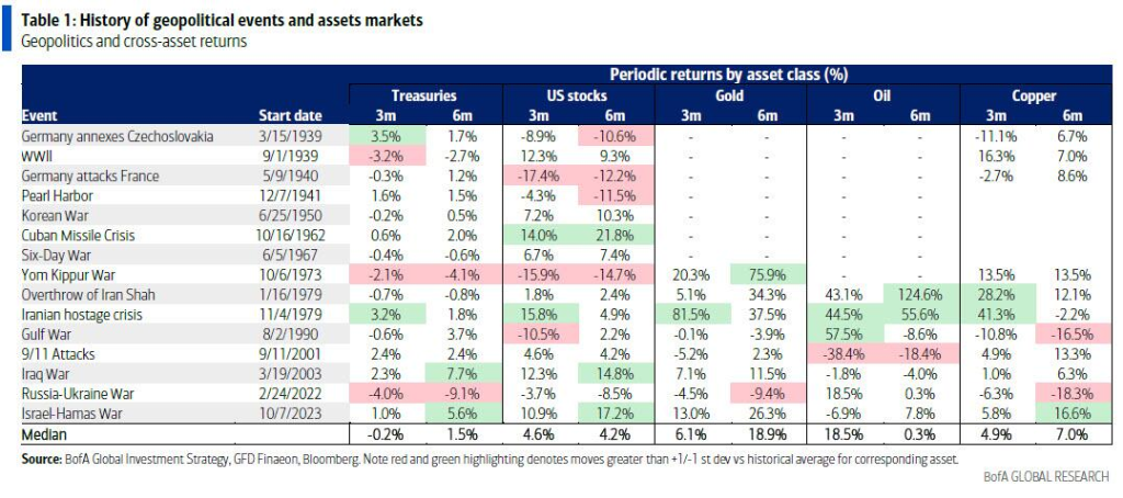 因此,Hartnett给出的策略格言言简意赅:“利用地缘政治震荡 = 交易石油(Trade Oil),持有黄金(Own Gold)。”