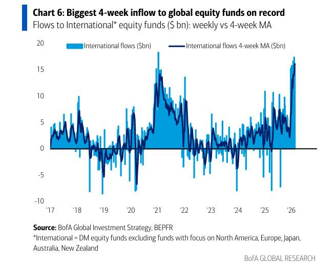 数据显示,国际股票基金录得创纪录的4周净流入(646亿美元),主要流向韩国(存储芯片概念)和日本(再通胀叙事)。其中,韩国股市更是录得史上最大规模的6周净流入,高达177亿美元。