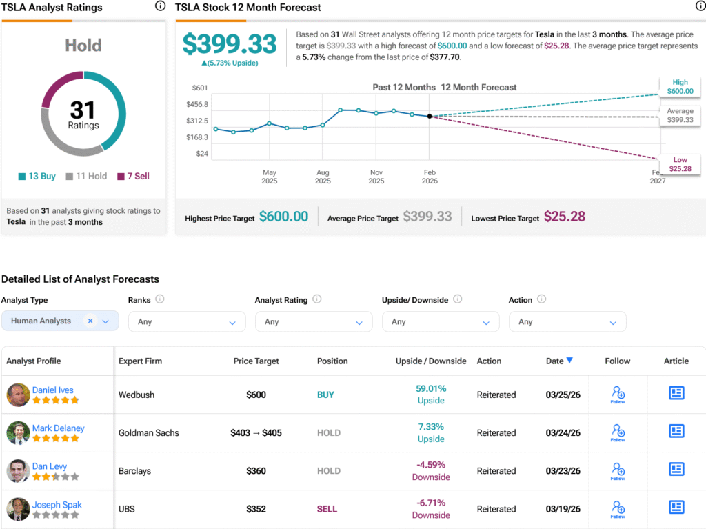 Turning to Wall Street, analysts have a Hold consensus rating on TSLA stock based on 13 Buys, 11 Holds, and seven Sells assigned in the past three months, as indicated by the graphic below. After a 41.31% rally in its share price over the past year, the average TSLA price target of $399.33 per share implies 5.73% upside potential.