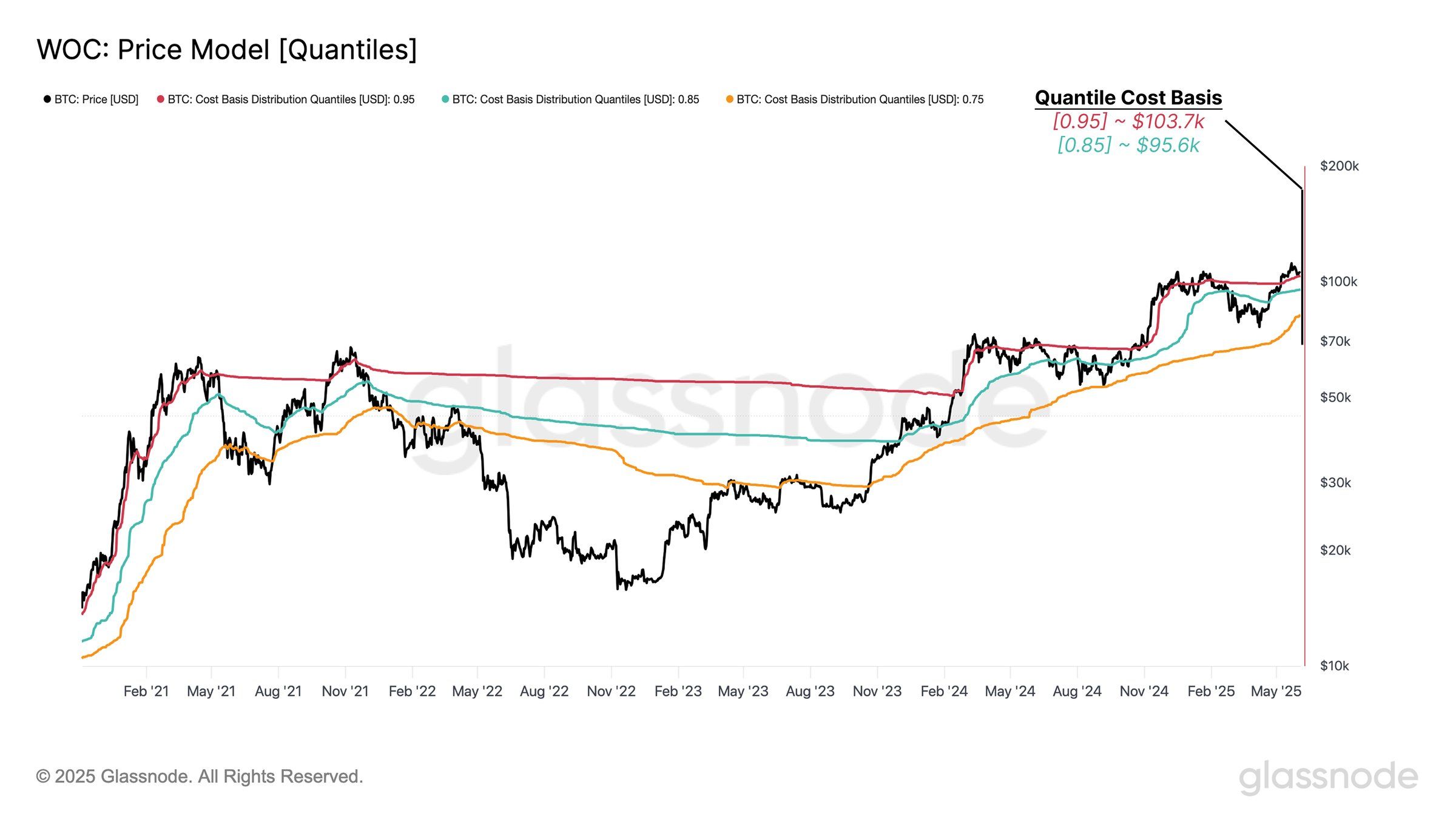 Сегменти базових витрат Біткойна показують важливі рівні підтримки, які можуть зіграти вирішальну роль у найближчому майбутньому. Індекс SSD (Розподіл Витратних Запасів) на рівні 0,95 свідчить про те, що 95% обігового запасу Біткойна було придбано за ціною нижче 103.700 USD. Це означає, що лише 5% Біткойна було придбано вище цього рівня, перетворюючи 103.700 USD на сильну зону підтримки.