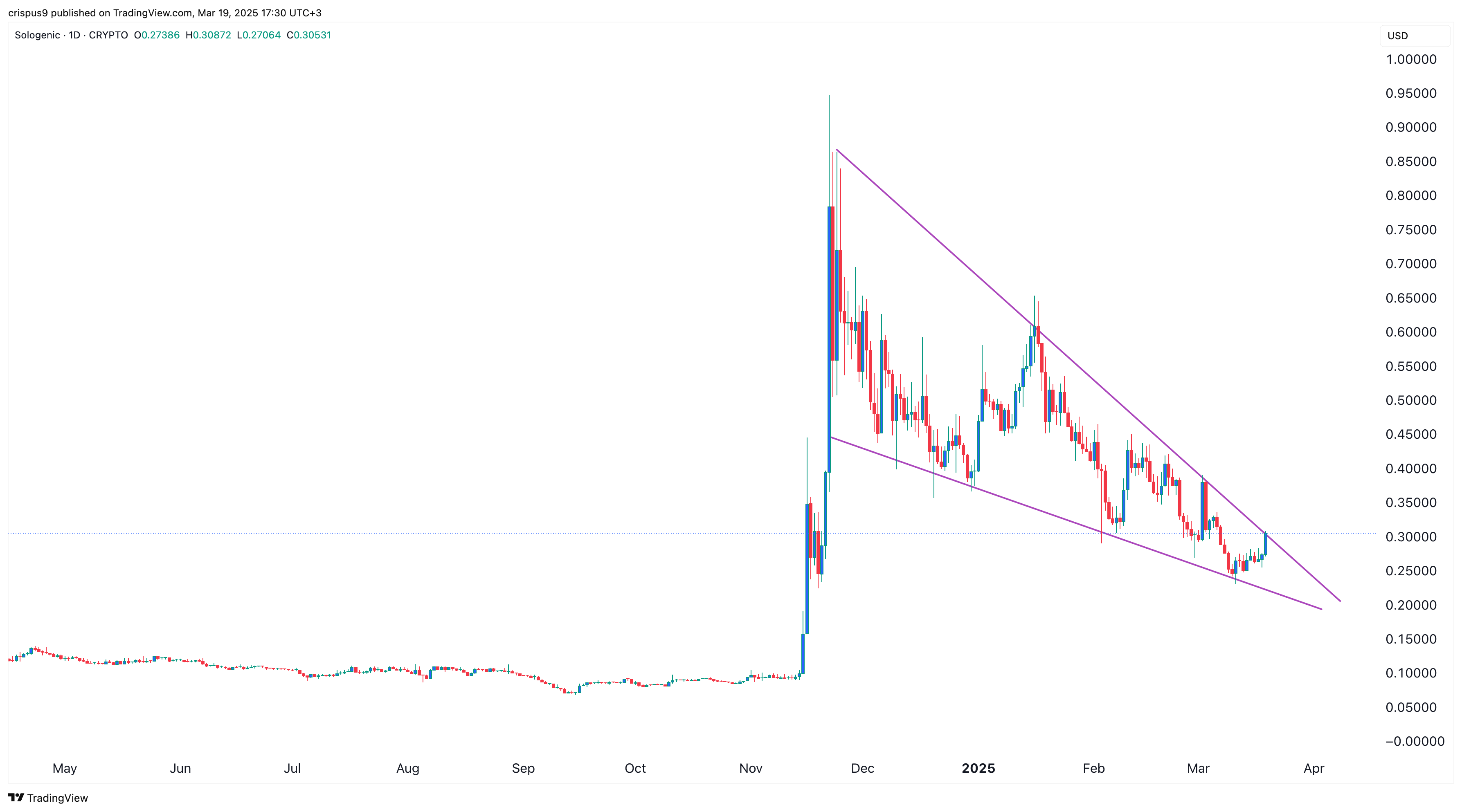 SOLO сформував падіння у вигляді клину на денному графіку, що вказує на потенційний відскок до $0.50 — приблизно на 62% вище за його поточний рівень.