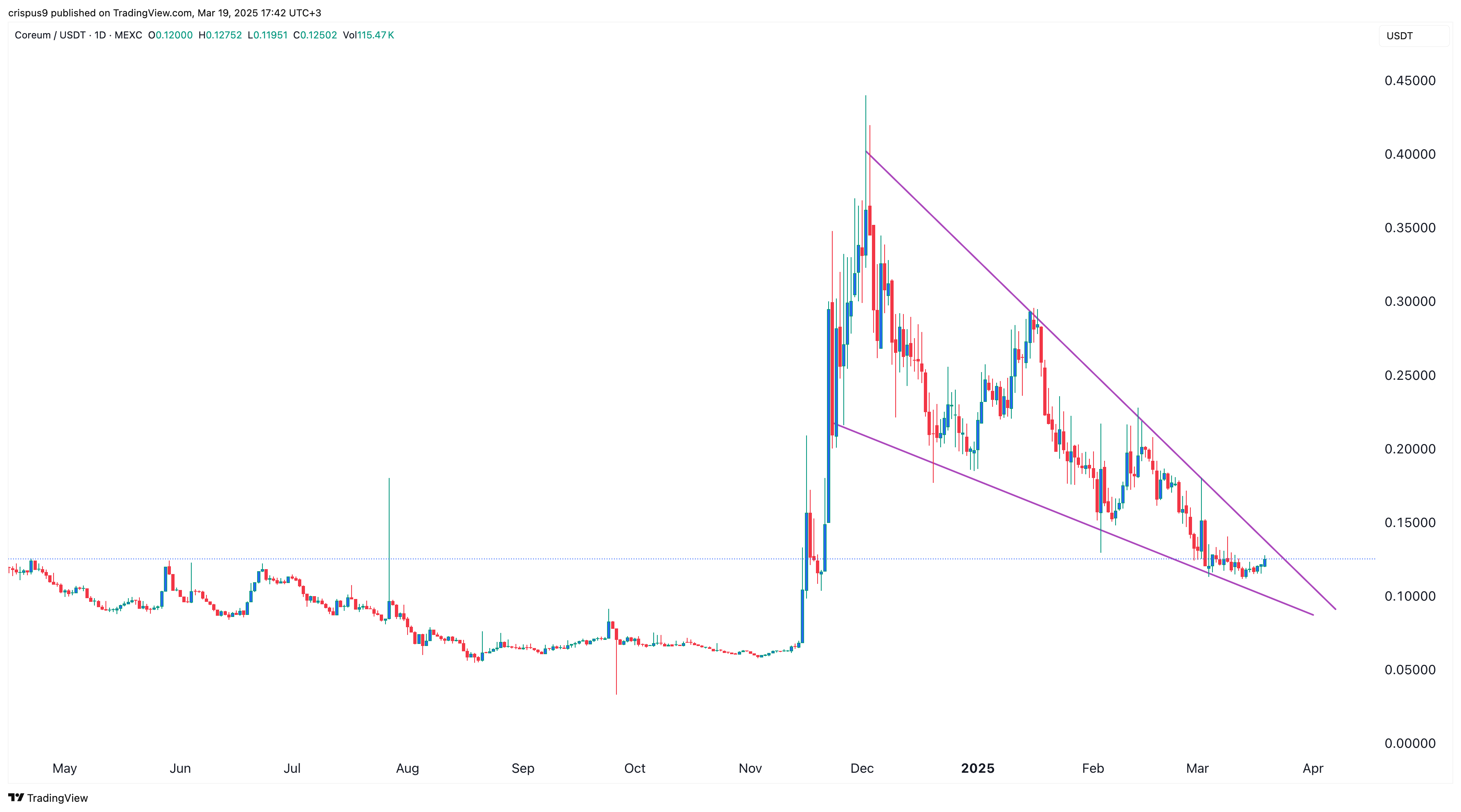 Ціна Coreum також сформувала патерн падаючого клину на денному графіку — бичачий сигнал у технічному аналізі.