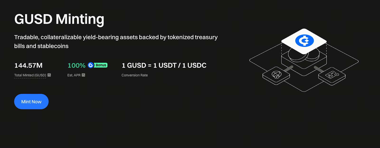 Lợi suất thưởng 100% hàng năm chỉ dành cho người dùng chưa từng nắm giữ GUSD hoặc tham gia mint GUSD. Người dùng đủ điều kiện sẽ thấy chi tiết phần thưởng sau khi đăng nhập; ưu đãi có giới hạn và tự động kết thúc khi phần thưởng được phân phối hết.