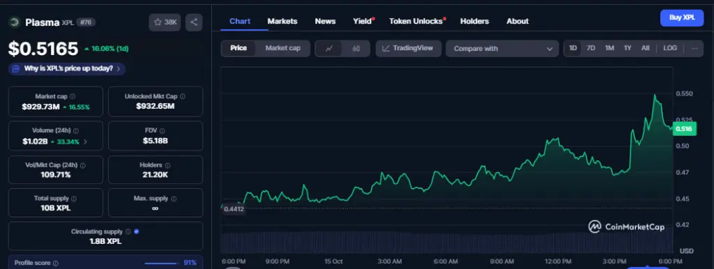Token gốc của Plasma được giao dịch ở mức $0.5165 sau khi giảm nhẹ từ đỉnh intraday của nó.