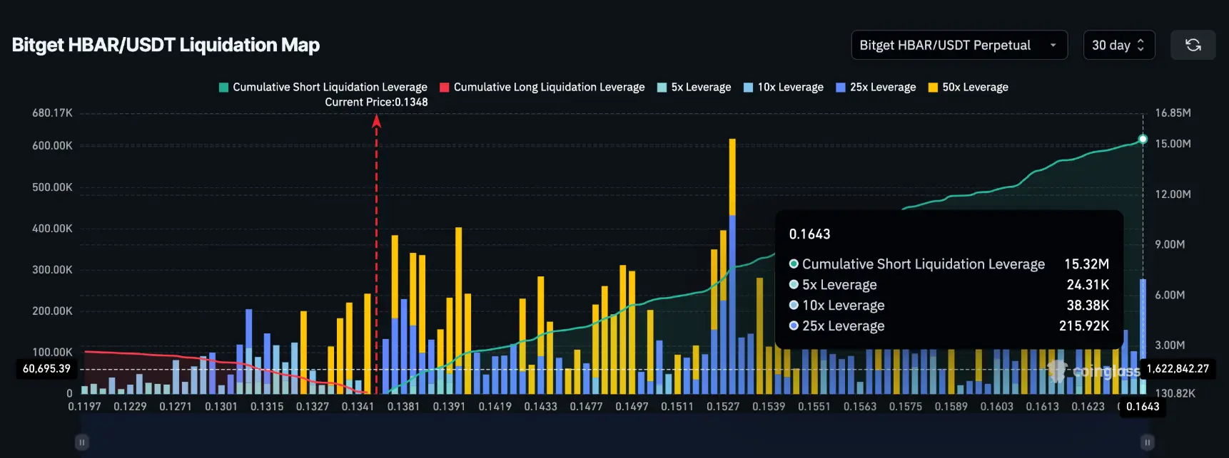 Bản đồ thanh lý cũng chỉ ra những điểm mà các trader dùng đòn bẩy có thể bị ép đóng vị thế nếu giá HBAR di chuyển đến các mức nhất định.