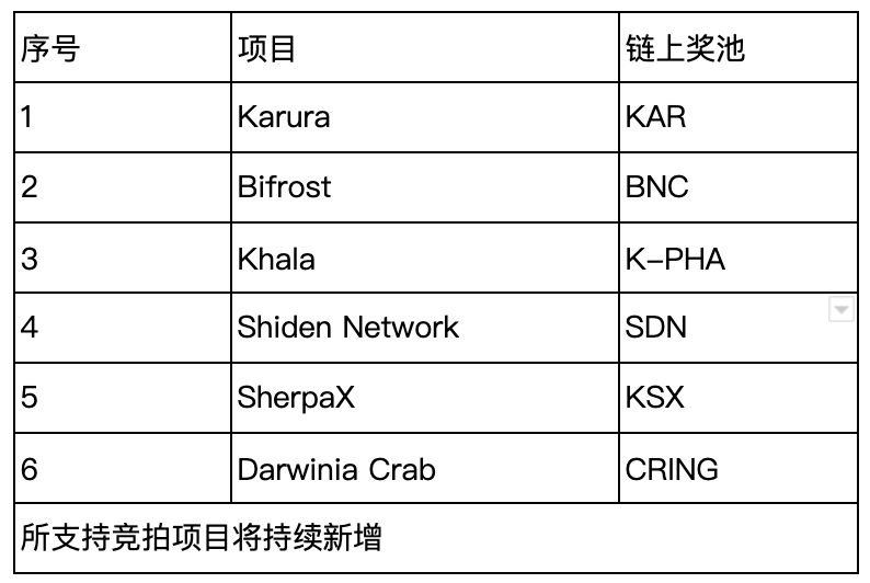 1.参与KSM锁仓:用户可充值或买入KSM,并参与本次锁仓,参与对应锁仓理财即助力相应竞拍项目。本轮助力项目及链上奖池包括: