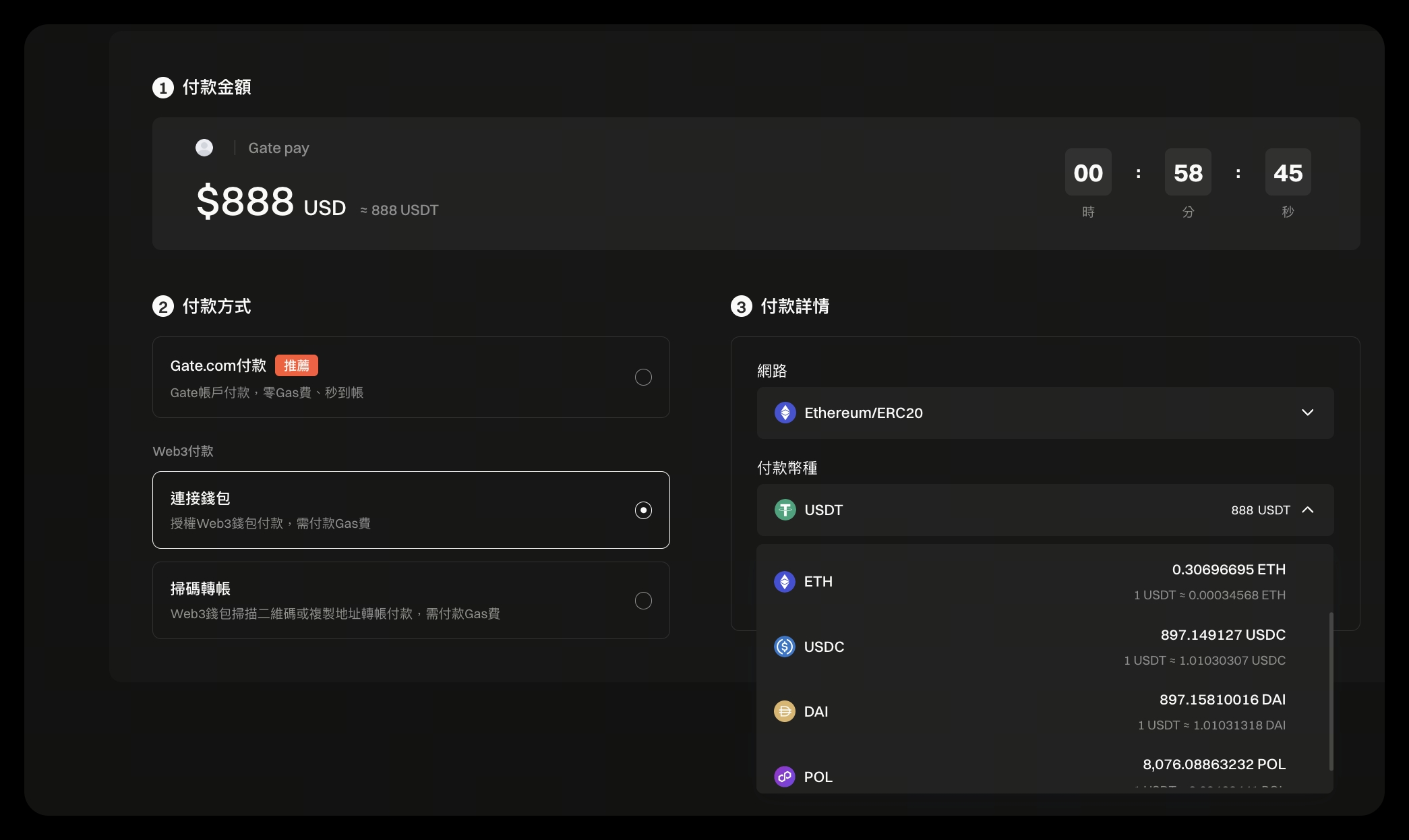 結帳時,用戶可自由選擇支付資產,系統將依據即時匯率自動顯示應付金額;支付完成後,Gate Pay 會自動將收款金額兌換為訂單指定的結算幣種並入帳,商戶無需自行處理匯率計算或跨幣種對帳,大幅降低營運複雜度。