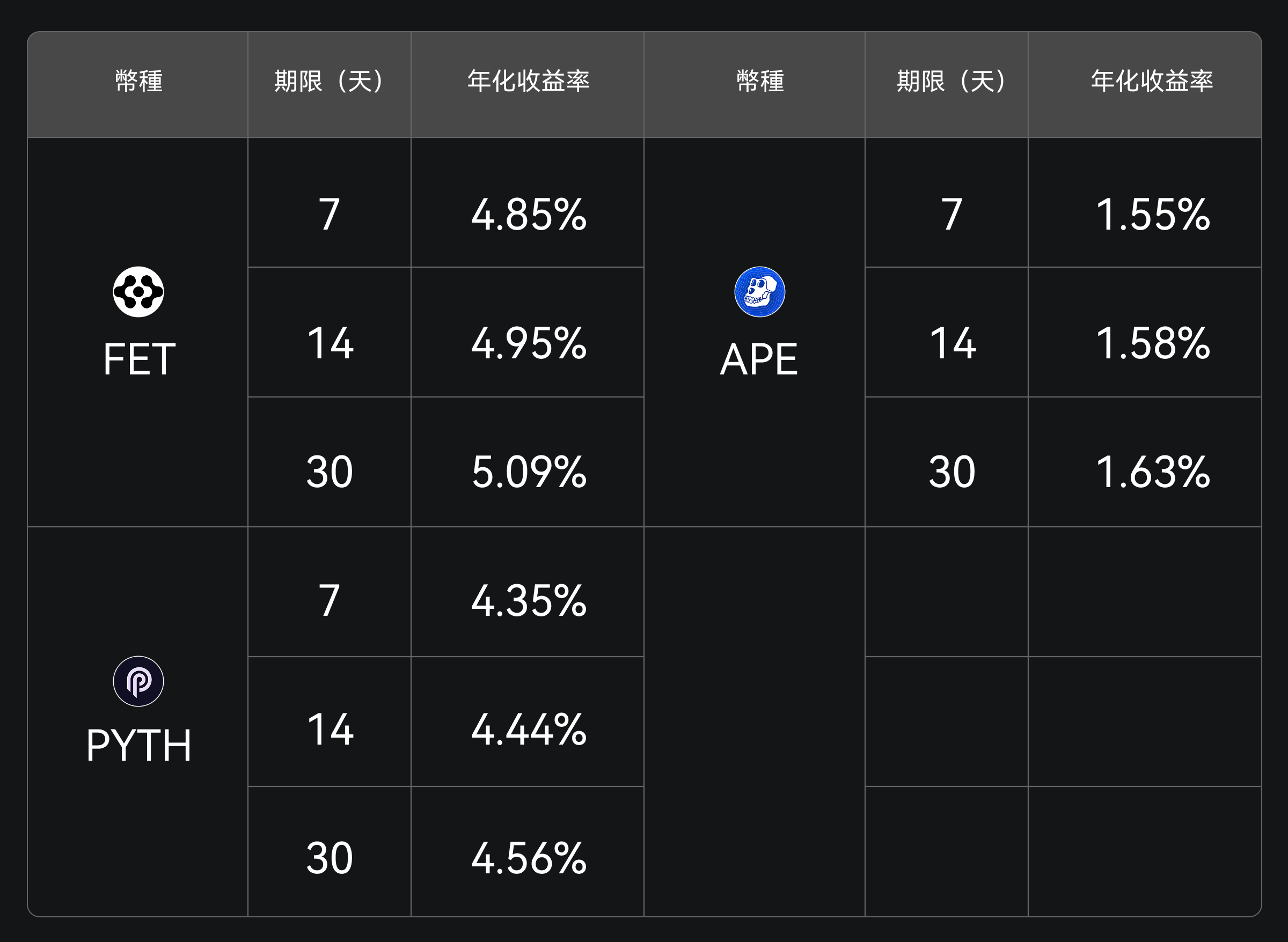 Gate 餘幣寶現已上線 FET、APE、PYTH 定期理財,提供 7 天、14 天、30 天三種鎖倉週期,歡迎前往參與申購。