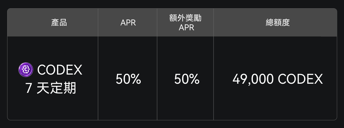 Gate 餘幣寶現已上線 CODEX 7 天定期理財,年化收益高達 100%。其中 50% 以 CODEX 利息形式發放,50% 以 USDT 額外獎勵形式發放。本產品總額度 49,000 CODEX,先到先得。