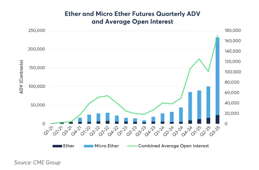 衍生品活動不僅限於比特幣,還擴展到以太坊的原生代幣以太幣,交易以太幣和微以太幣期貨大幅上升。