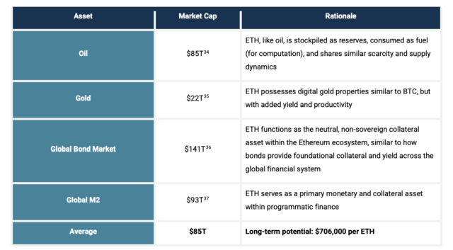 以太坊(ETH)的技術專家們在本週發布的面向機構投資者的報告中主張,ETH “被大幅低估”。新成立的智庫 "Etherealize "的聯合創始人維韋克·拉曼等21名共同作者分析認爲,與石油等商品相比,ETH的長期價格可能達到8萬美元(甚至有觀點認爲可能達到70萬美元)。(以下內容摘自報告)