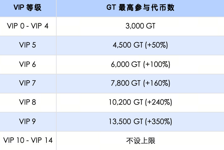 完成身份认证;GT 持仓 ≥ 1 GT,可按照 GT 持仓快照量占比瓜分总奖池。每位 VIP 0 - VIP 4 用户本次活动参与上限为 3,000 GT,VIP 10 及以上用户最高可享【不设上限】的参与额度。