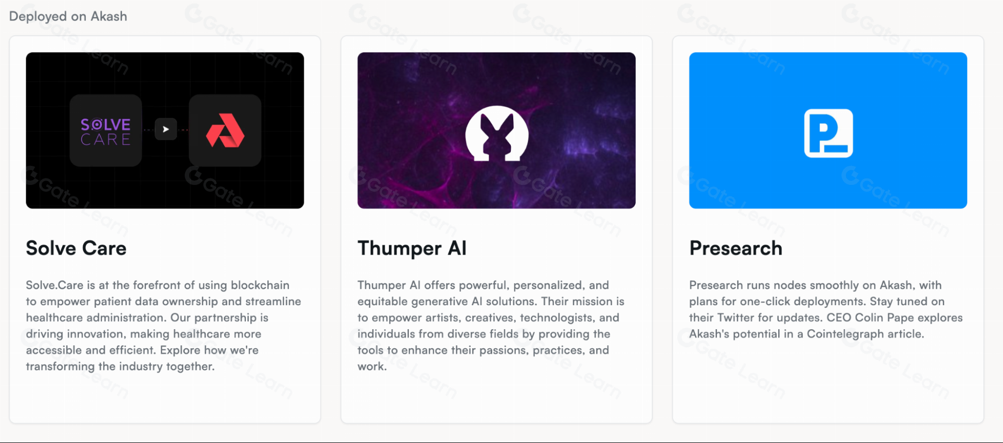 Akash Network 承载着各种去中心化应用,并已建立战略合作伙伴关系,以展示其多功能性和创新性。主要合作包括医疗保健服务的 Solve.Care 和人工智能模型训练的 Thumper AI。Akash 支持复杂的 AI 和机器学习操作,承载着各种 dApp,提供灵活且可扩展的计算资源,从而降低成本并提高服务质量。社区驱动的方法确保了持续开发并符合用户需求。