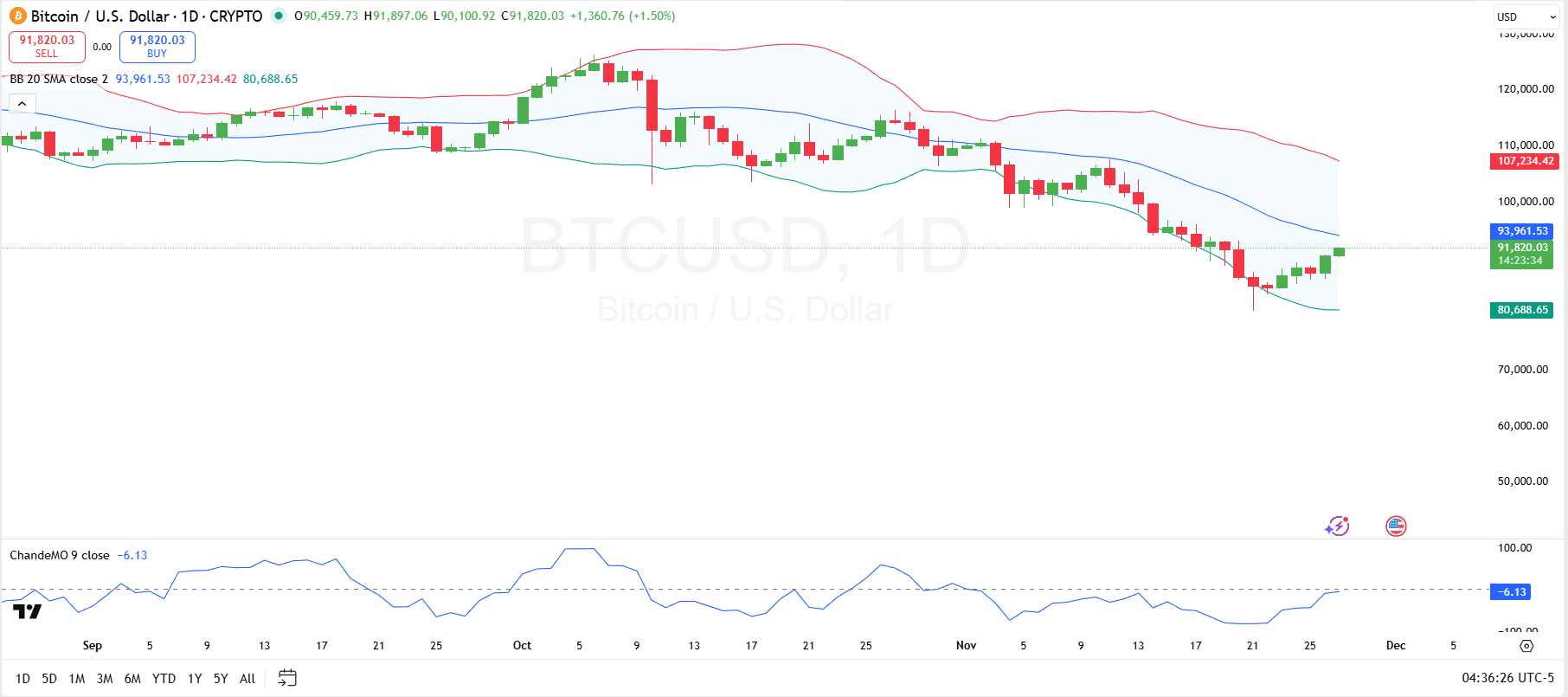 从TradingView的日线图来看,比特币的价格走势在沿着下方布林带急剧下滑后开始回归正常。值得注意的是,蜡烛已经从靠近下方布林带的近期低点反弹,目前位于约$80,680,并且现在正向20日简单移动平均线附近的$93,958推进。