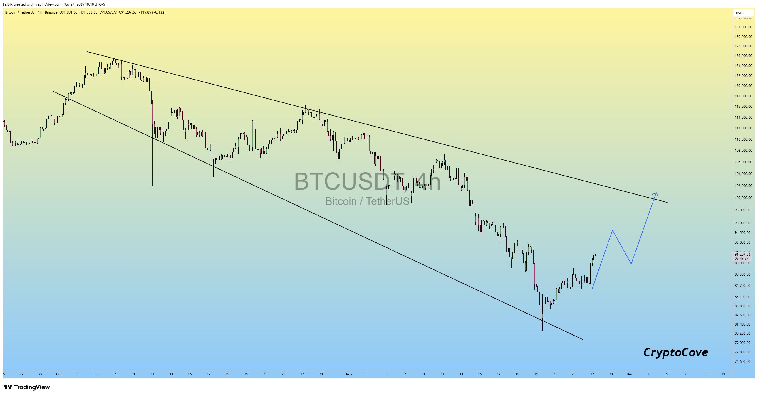 比特币在熊市将其暴露于$80,000支撑区后正上演反弹。在过去的24小时内,BTC上涨了约4.7%,买家将价格从中间的$86,000区域抬升至超过$91,000,因为对美联储降息的预期推动了一波重新的投资者兴趣。