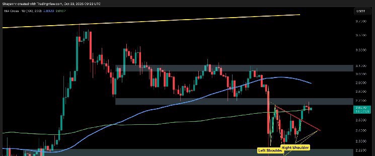 然而,市场现在面临着约$2.7的主要阻力汇聚,这与颈线结构和最近供应区的上边界相一致。这个区域代表了多头的第一次决定性考验。在$2.7以上的干净收盘将确认结构趋势反转,为$2.9–$3.1的阻力簇打开道路。