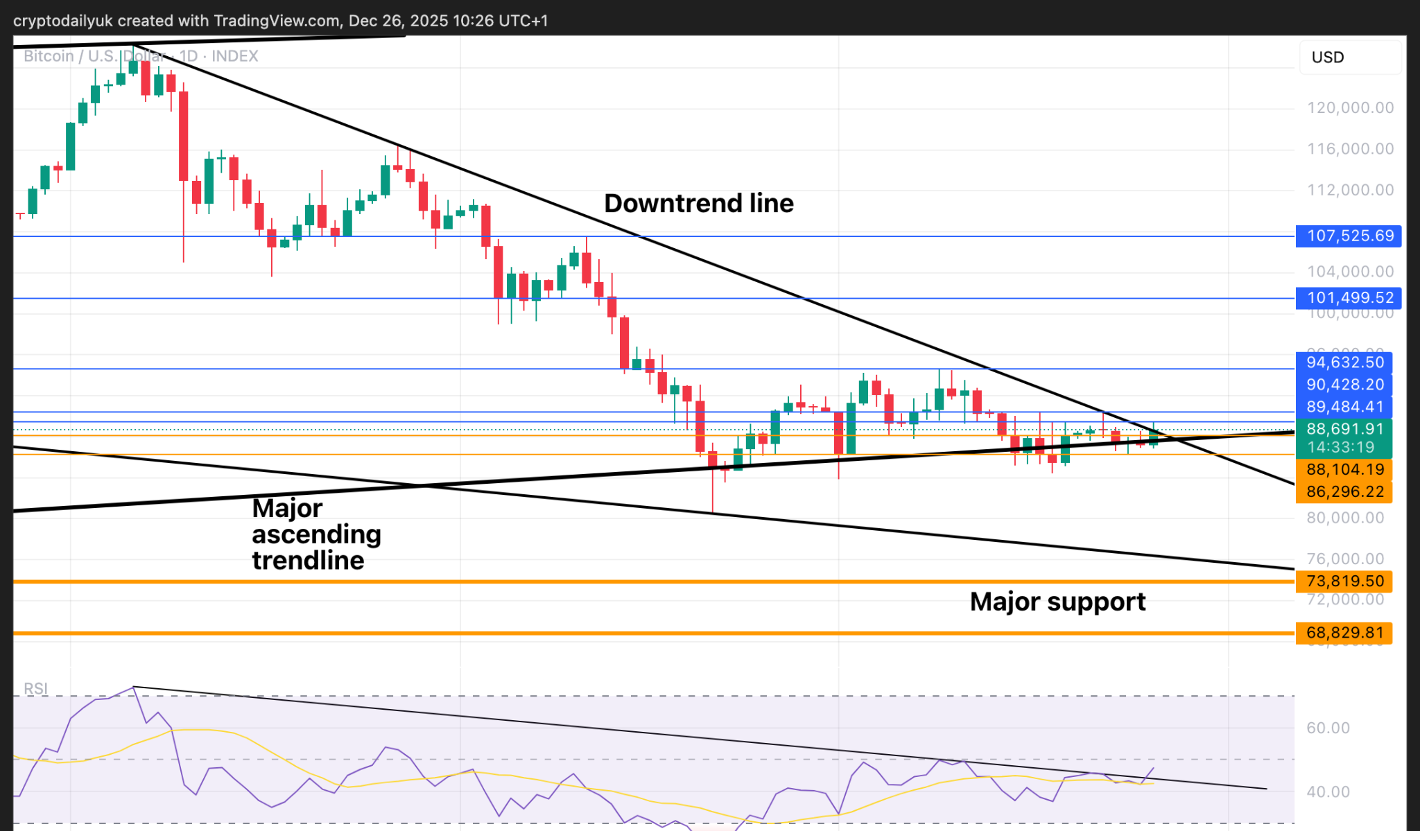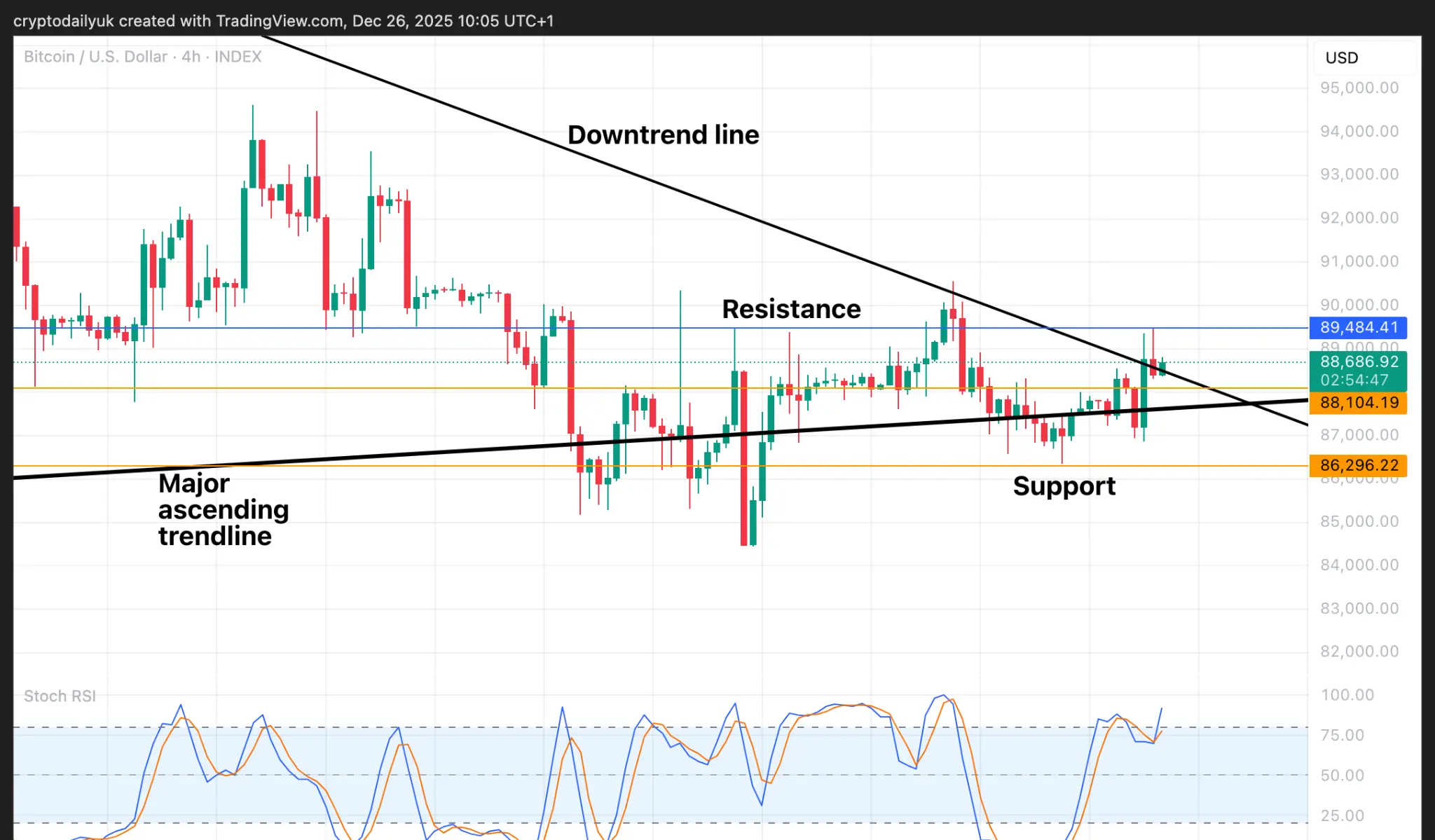 如果多头要占据主动,他们需要确认至少一根实体蜡烛在下跌趋势线上方,可能还需要两到三根日线实体蜡烛保持在趋势线以上,以更有信心这次突破是真实有效的。之后,还需要突破$90,000的水平阻力。