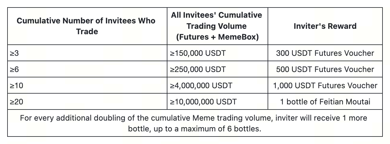 - For Task 1, only one reward can be claimed. For Task 2, based on the final number of invitees who trade in Futures or MemeBox and their cumulative trading volume, only one tier of reward can be claimed.