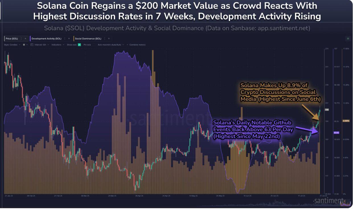 تجاوز سعر Solana (SOL) علامة 200 دولار، للمرة الأولى منذ عدة أشهر، مما أثار مناقشات واسعة في مجتمع الأصول الرقمية. مع ارتفاع السعر، بلغت متابعة Solana على وسائل التواصل الاجتماعي أعلى مستوى لها منذ يونيو، حيث أصبحت حرارة وسائل التواصل الاجتماعي مؤشرًا مهمًا لمشاعر السوق.