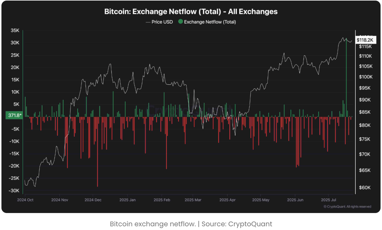 أكد محلل آخر في CryptoQuant شايان ماركتس أن هناك تغييرات ملحوظة في النشاط داخل السلسلة لعملة البيتكوين. تشير أحدث البيانات إلى أن البيتكوين شهدت أكبر تدفق صافي إلى البورصات منذ يوليو 2024. وهذا يشير عادةً إلى أن حاملي العملة مستعدون للبيع، مما يزيد من كمية البيتكوين المتاحة، مما قد يضغط على السعر نحو الانخفاض.
