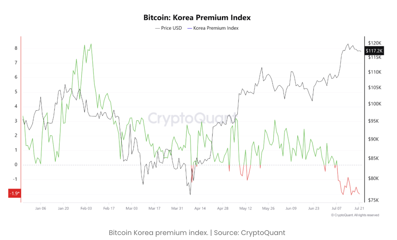 تراجع الطلب في الولايات المتحدة وكوريا الجنوبية، مما يعكس تغيرات في مشاعر السوق وفقًا لتحليل CryptoQuant ، فإن السوقين الأمريكي والكوري الجنوبي ، اللذين لهما تاريخيًا مساهمة كبيرة في حجم تداول بيتكوين ، يعانيان من ضعف واضح في الطلب. أشار محلل CryptoQuant Arab Chain إلى أنه على الرغم من أن سعر بيتكوين حقق رقمًا قياسيًا جديدًا ، إلا أن مؤشر Premium الرئيسي لـ CEX في الولايات المتحدة (الذي يقيس الفرق في سعر بيتكوين بين هذا CEX والأسواق العالمية الأخرى) لم يرتفع بشكل ملحوظ. يظل هذا المؤشر عند مستوى مماثل لشهر يونيو ، مما يشير إلى أن المستثمرين الأمريكيين لم يشتروا بيتكوين بنشاط خلال هذه الانتعاشة.